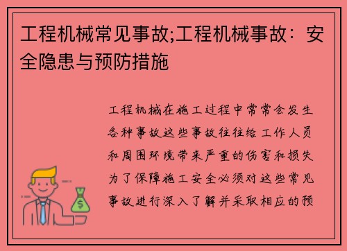 工程机械在施工过程中常常会发生各种事故,这些事故往往给工作人员和周围环境带来严重的伤害和损失。为了保障施工安全,必须对这些常见事故进行深入了解,并采取相应的预防措施。本文将从以下六个方面对工程机械常见事故进行详细阐述。